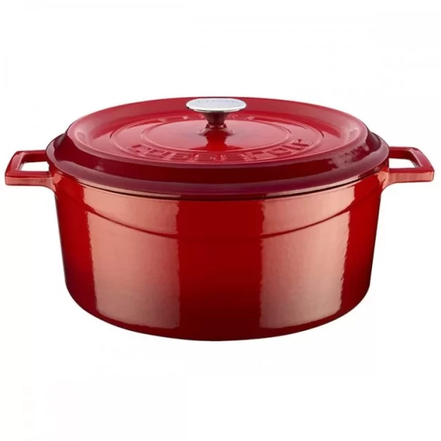 Crvena emajlirana posuda od lijevanog željeza dimenzija 23×29 cm, s poklopcem. Dugotrajna, izdržljiva i izvrsna za razna jela.