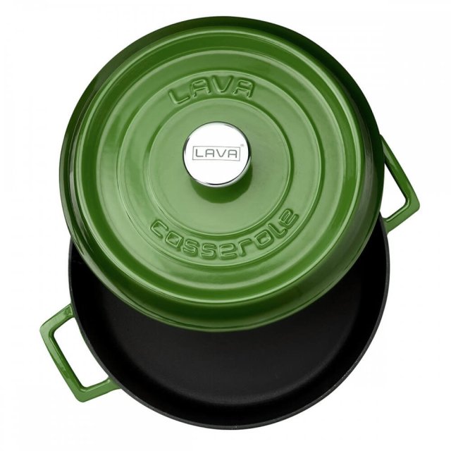 Zelena emajlirana posuda od lijevanog željeza Lava promjera 32 cm s poklopcem. Dva puta pečena zdjela s troslojnim emajliranim premazom. Kanali u posebno dizajniranim poklopcima skupljaju paru i vraćaju je u hranu.