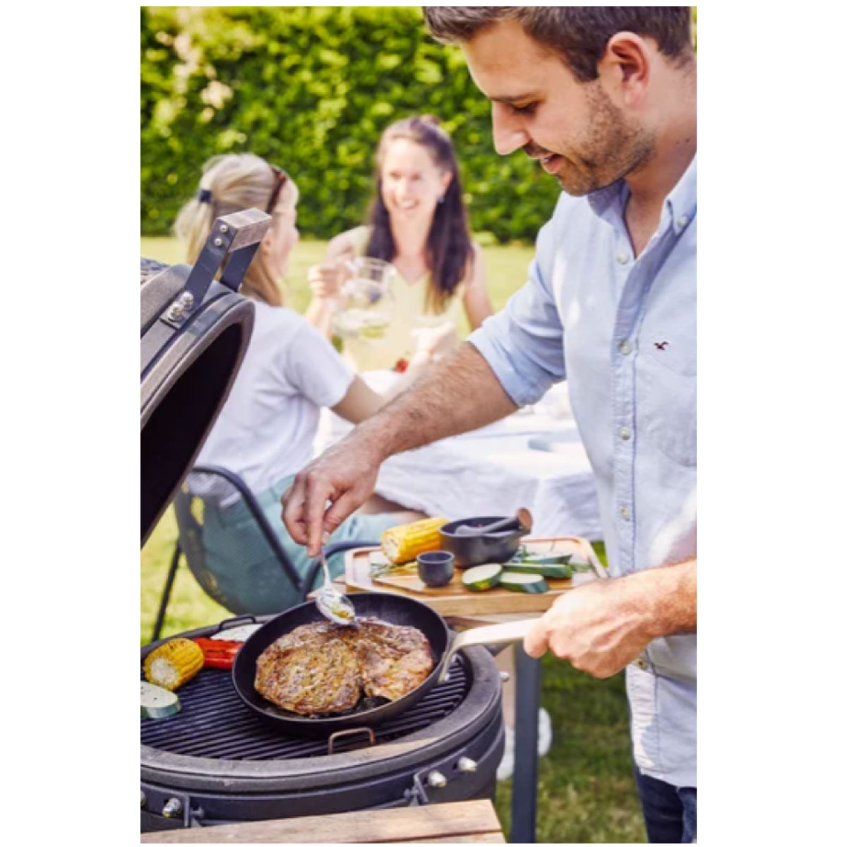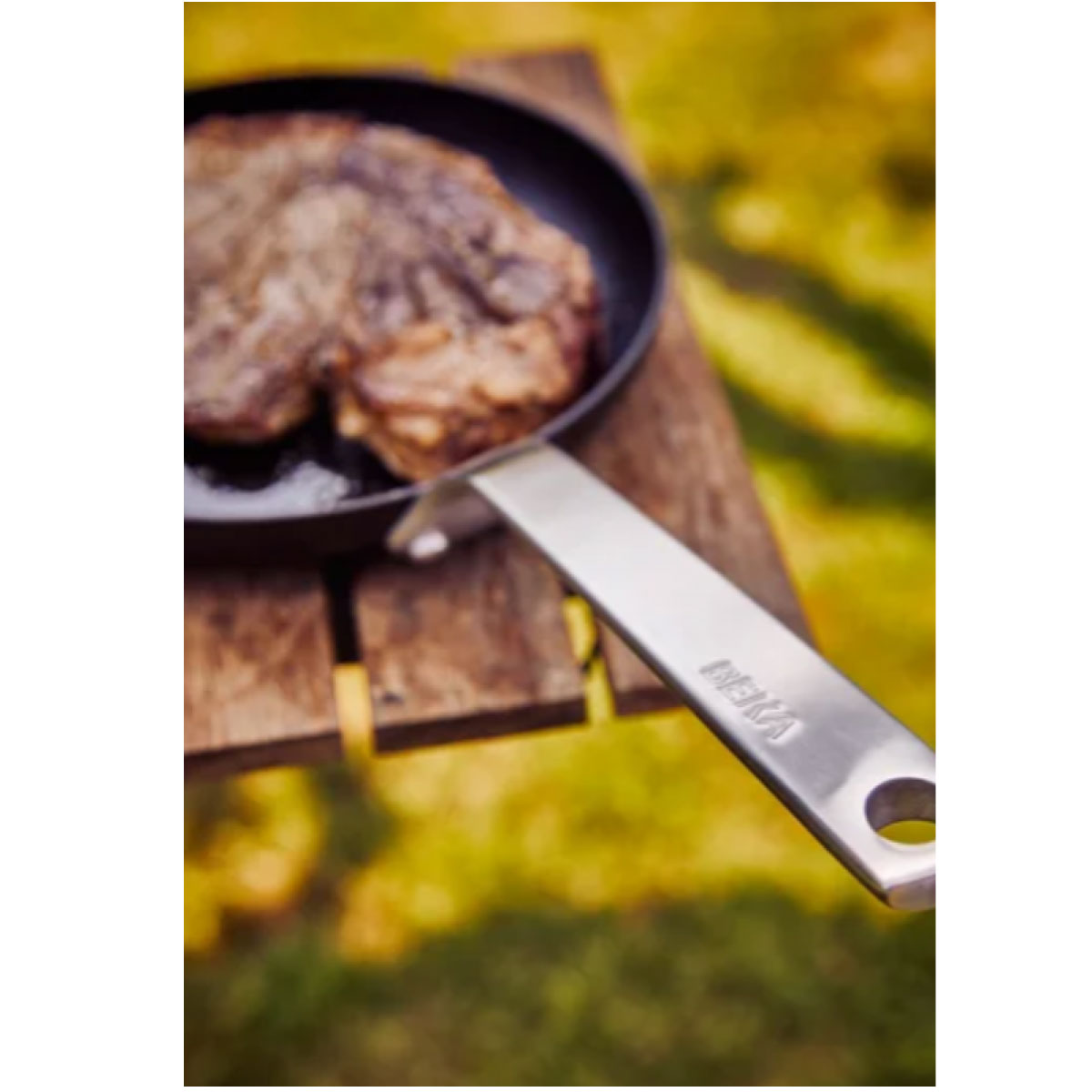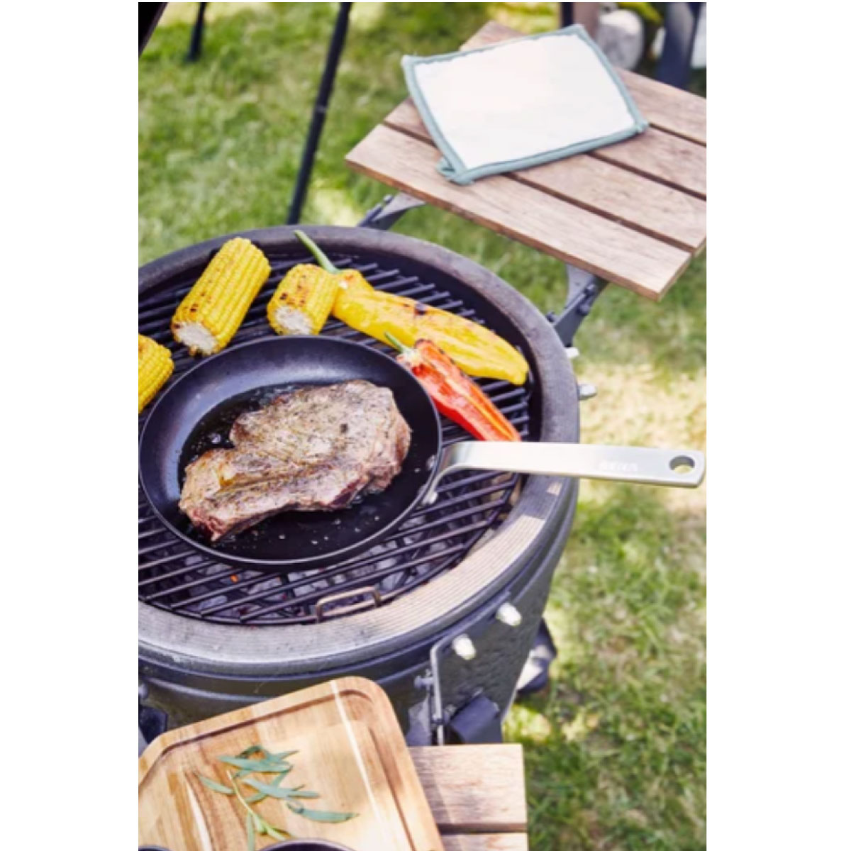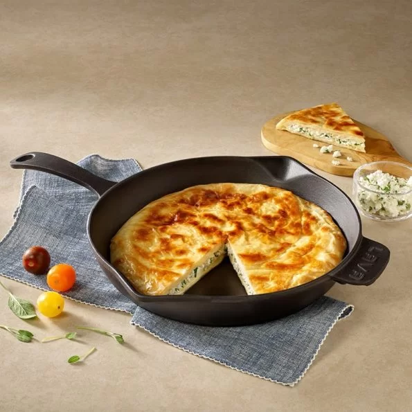 Tava od lijevanog željeza je pouzdani partner kućnog kuhara. Posuda od lijevanog željeza jako se zagrijava kada je potrebno i također zadržava toplinu. Uz pravilnu njegu, tava od lijevanog željeza trajat će godinama, iz generacije u generaciju, i s godinama će biti samo bolja. Kompatibilan sa svim pločama za kuhanje. Ova tava je prethodno tretirana biljnim uljem i njezina neprianjajuća svojstva poboljšavaju se sa svakom upotrebom. Ručno operite vrućom vodom i temeljito osušite, a zatim po potrebi obrišite posudu uljem za kuhanje. Tave od lijevanog željeza nisu prikladne za čuvanje hrane. Otpornost na toplinu 260 stupnjeva.