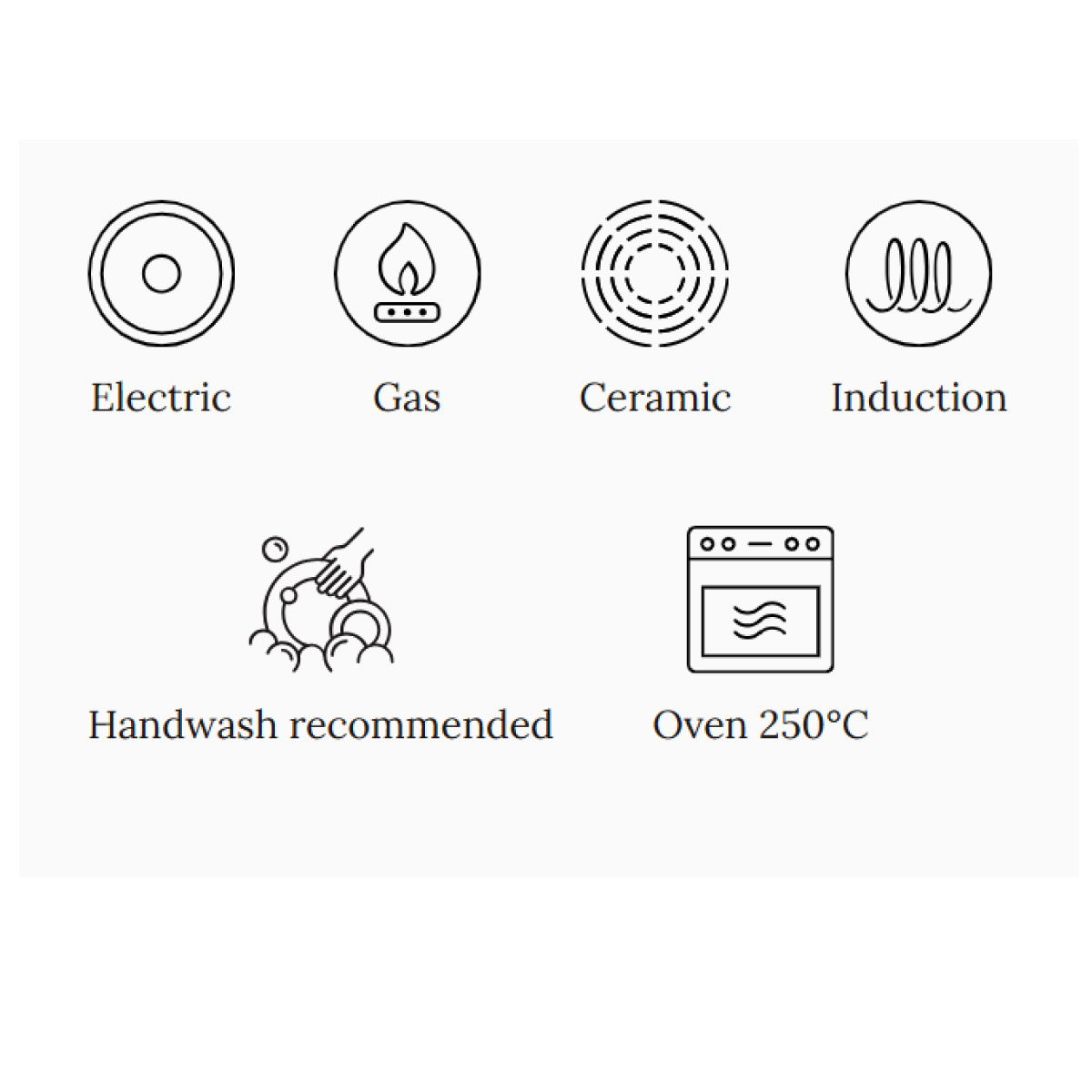 - Pogodno za korištenje na: plinskom štednjaku, staklokeramici, indukciji i električnim pločama za kuhanje. Za korištenje u pećnici.