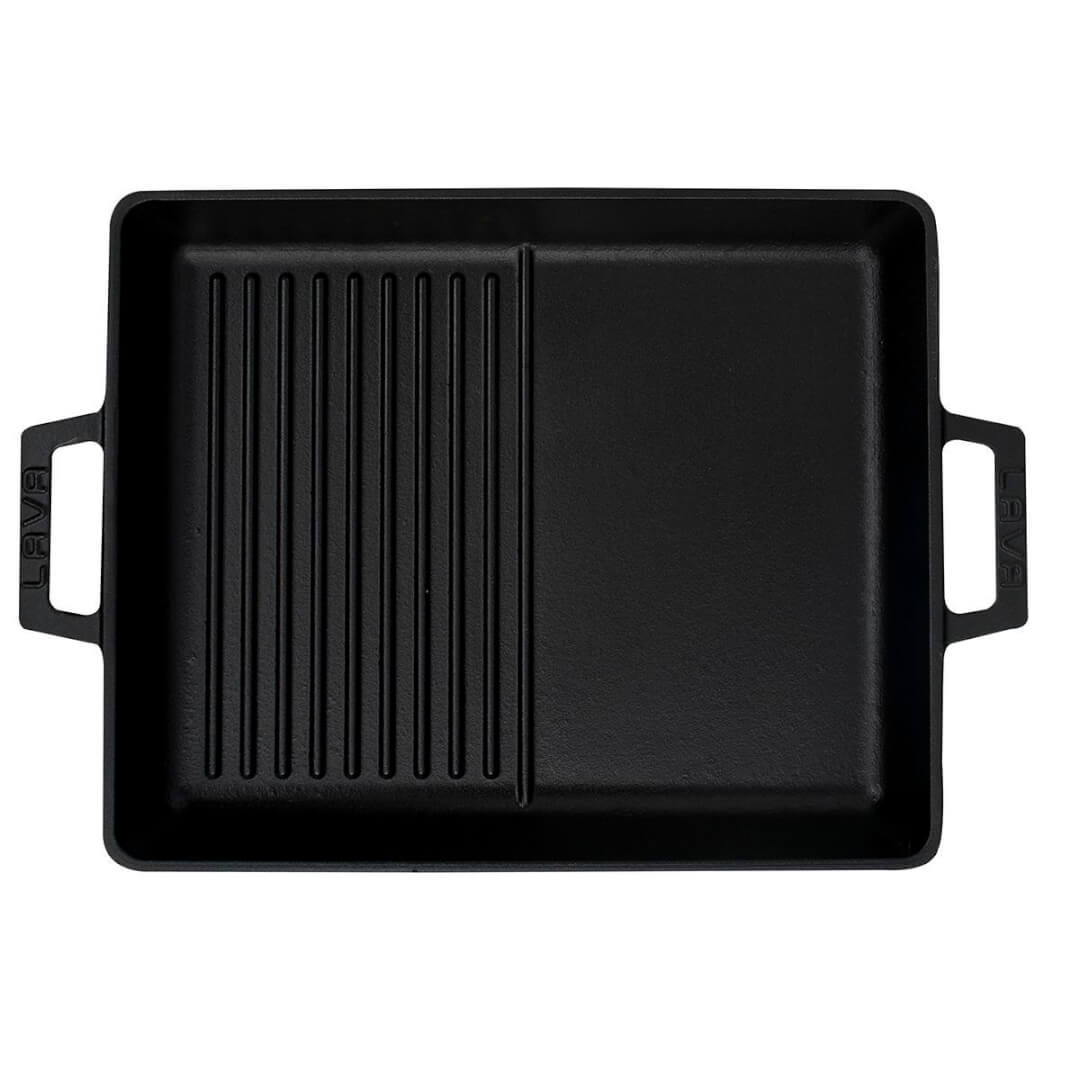 Lava grill tava od lijevanog željeza dimenzija 26×32 cm. Prikladno za korištenje na svim pločama za kuhanje: plin, struja, staklokeramička ploča, indukcija, pećnica i roštilj.  Rebrasto dno ostavit će karakterističan trag roštilja na mesu, ribi ili povrću.