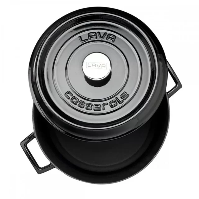 Crni emajlirani lijevanoželjezni lonac Lava promjera 28 cm s poklopcem. Izvrsno zadržava toplinu i prikladan je za sve vrste kuhalnih površina.