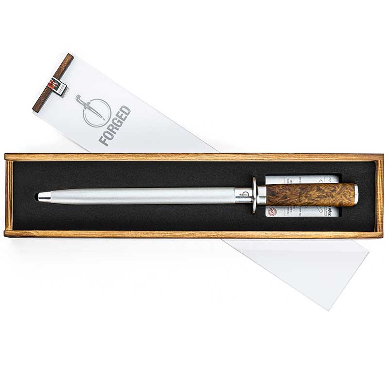 Dijamantna šipka izoštrit će nož i ispraviti sve nepravilnosti na površini rezanja te vratiti oštrinu. Povučete li nož nekoliko puta cijelom oštricom uzduž brusa, opet postaje oštar. Važno je da nož uvijek držite pod istim kutom. Dijamantna brusna šipka ili brusni kotač pakirani su u luksuznu drvenu kutiju.