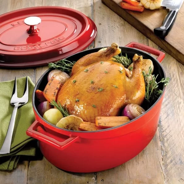 Crvena emajlirana posuda od lijevanog željeza dimenzija 23×29 cm, s poklopcem. Dugotrajna, izdržljiva i izvrsna za razna jela.