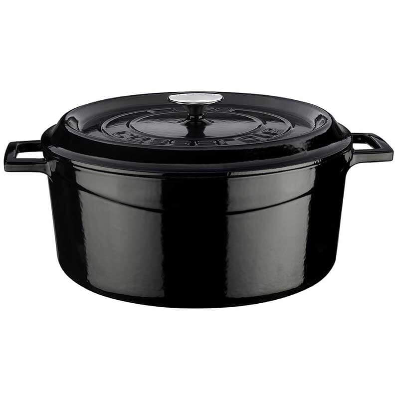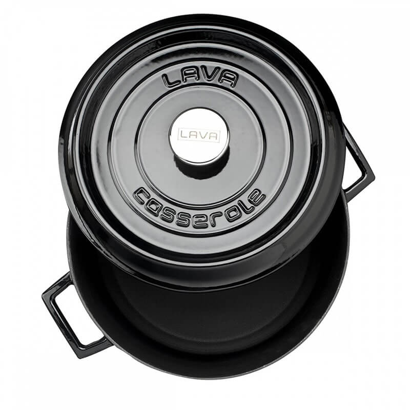 Crno emajlirana posuda od lijevanog željeza Lava, promjera 32 cm, s poklopcem. Dva puta pečena zdjela s troslojnim emajliranim premazom. Kanali u posebno dizajniranim poklopcima skupljaju paru i vraćaju je u hranu.
